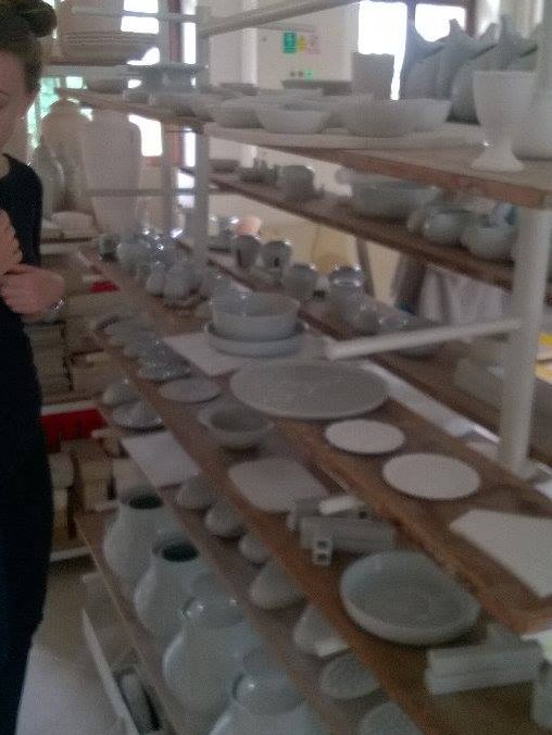 The forms were shaped using plaster on the wheel, then molded, cast, and fired. Three graduated sizes, each with structural supports on the underside responding to scale and weight.
