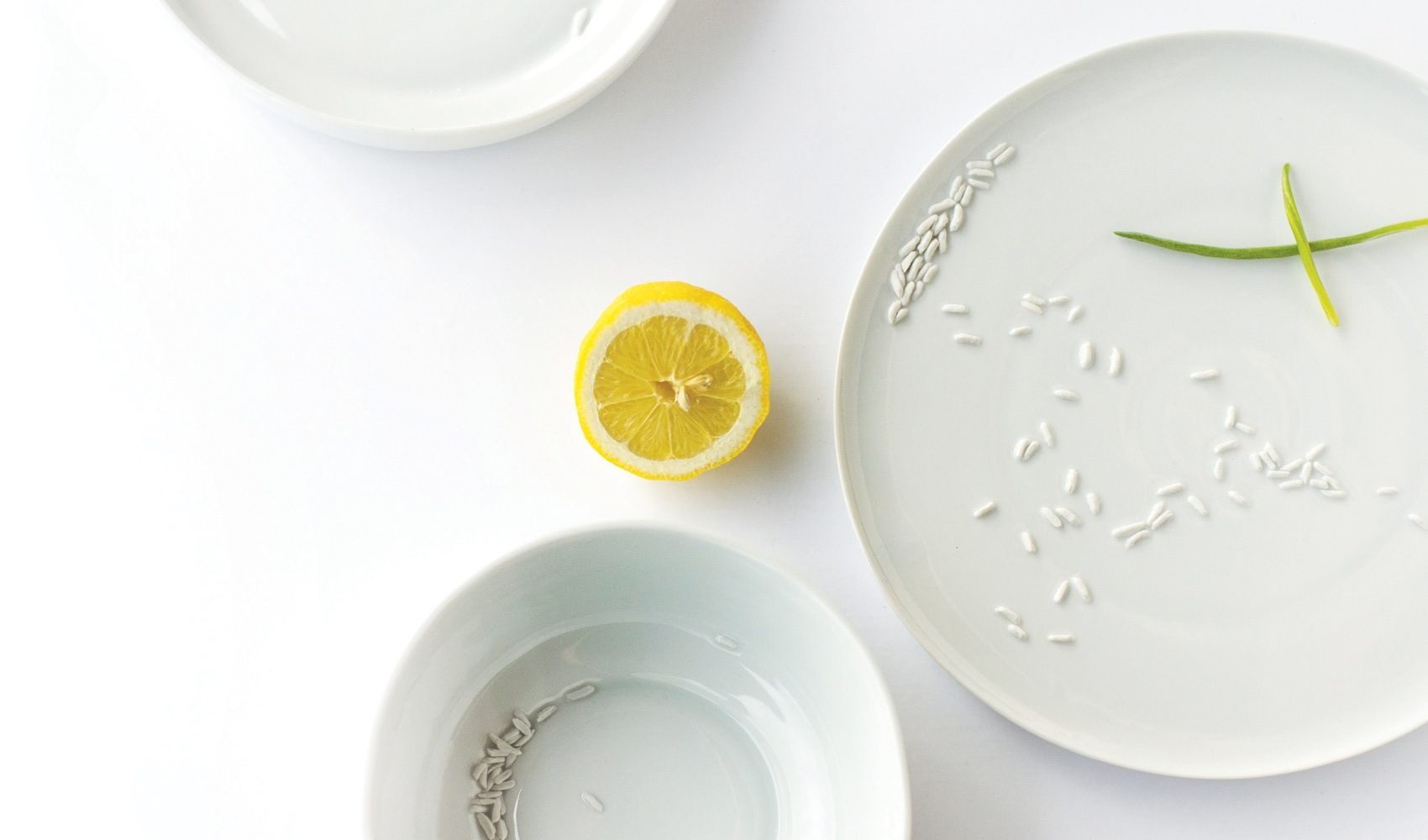 This series reinterprets “rice porcelain” through literal application. I boiled rice, used indivdual grains to create molds, cast them in porcelain, fired them, and attached them to plates and bowls as surface detail.